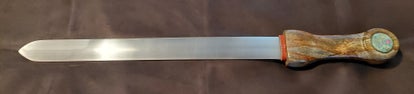 THE TEACHER WITHIN: Moroccan selenite, Soapstone handle, Ruby w/Zoisite, 21” long (53cm). This sword activated my creativity with downloads for solving challenges with this piece, hence the name. Selenite brings clarity of mind, opening the Crown and higher Crown chakras while accessing angelic consciousness and higher guidance. Soapstone provides grounding stability, practical wisdom and creativity, resilience and adaptability. Ruby with Zoisite enhances with passionate vitality of the Ruby and heart-centered calm from the Zoisite; emotional balance from bridging the heart (Ruby), and the mind (Zoisite) stimulates creativity. This is a spiritual tool, not a weapon.