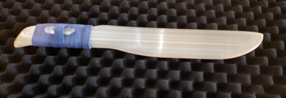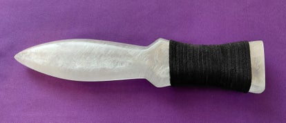 This is a big knife, 2 1/4 inches by 15 inches long (38.1cm), made from Moroccan selenite. The handle is wrapped with blue leather lacing with a quartz crystal bound into the lacing. Uses: clearing other crystals, home space, and auras or a set intention for use. The powerful one-sided blade brings maximum cutting and focused energy. A spiritual energy tool, not a weapon.